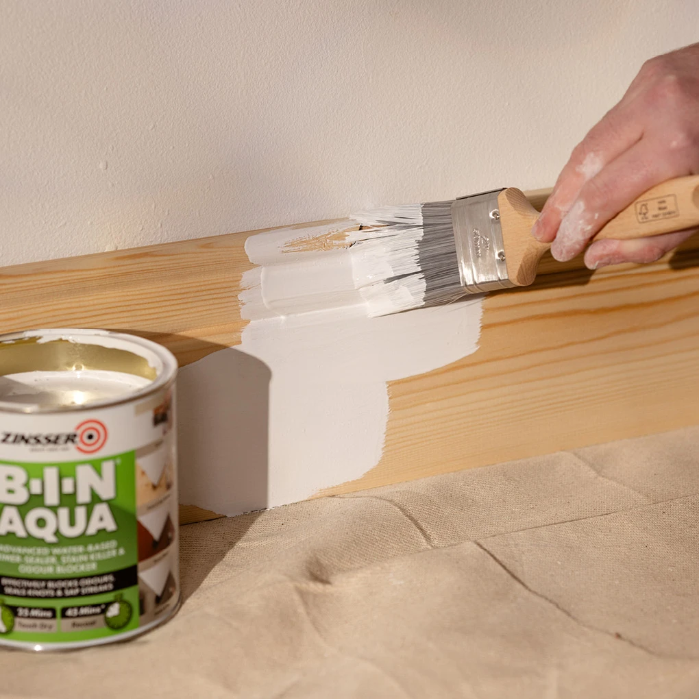 Begin by spot-priming the knots with our specialised primer Zinsser B-I-N®. For a water-based alternative, B-I-N® AQUA will also effectively block knots and sap streaks, with the added benefit of low odour and full exterior use. Once the knots are properly sealed, you can proceed to prime the entire surface.