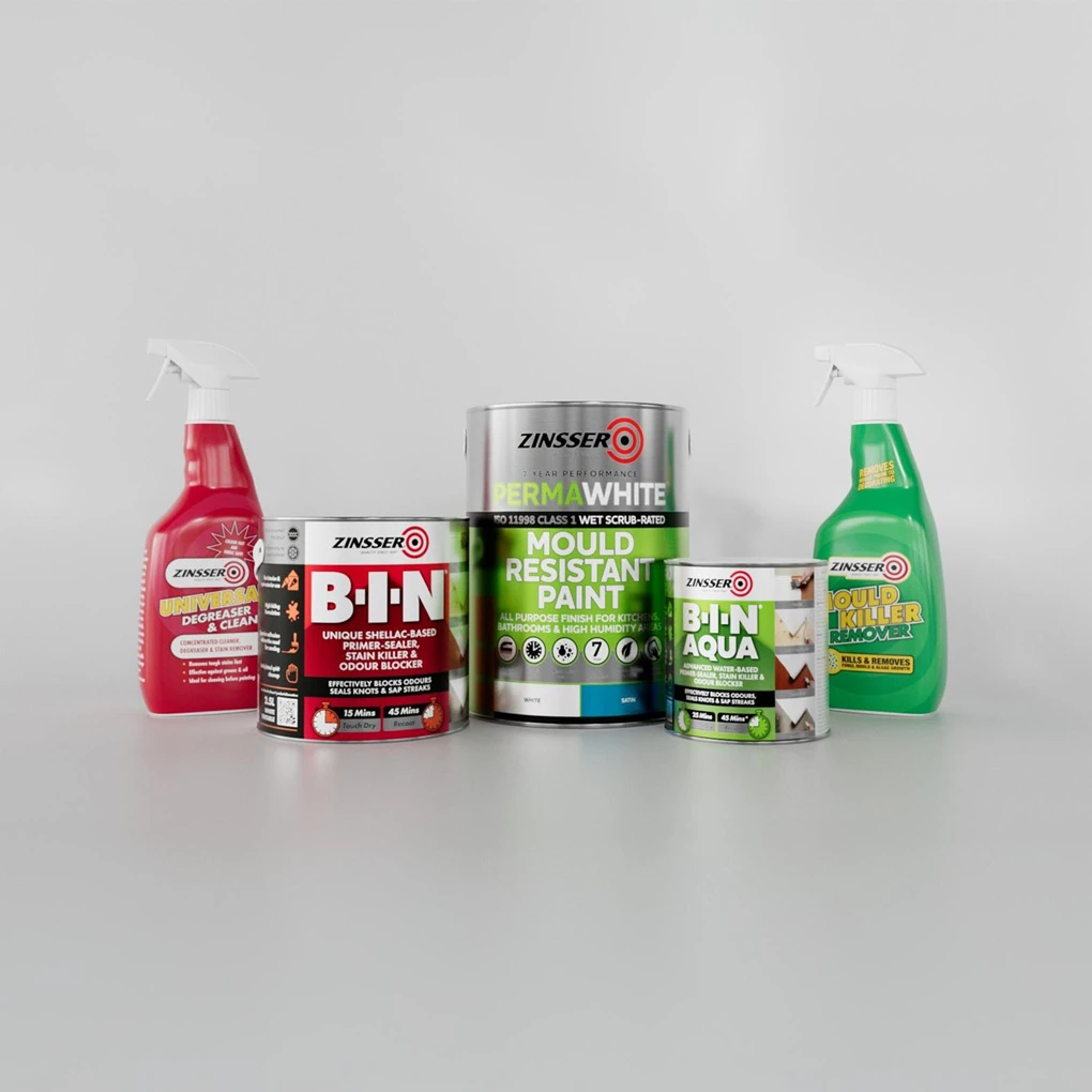 Remove visible signs of organic growth and treat the areas with Zinsser Mould Killer in accordance with the manufacturer’s instructions. Allow to dry. Fill any cracks and small surface defects with a suitable filler as appropriate. Allow to dry. Rub down with a fine grade abrasive paper. Remove all dust.