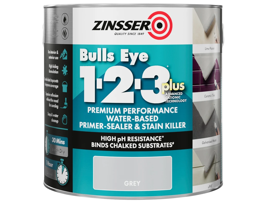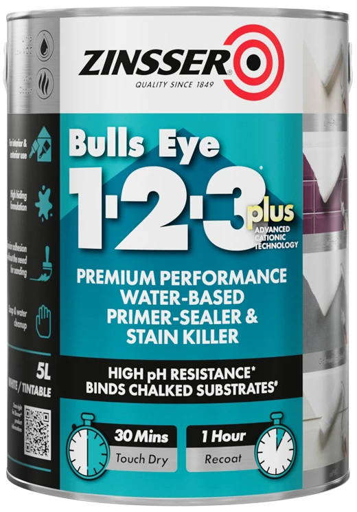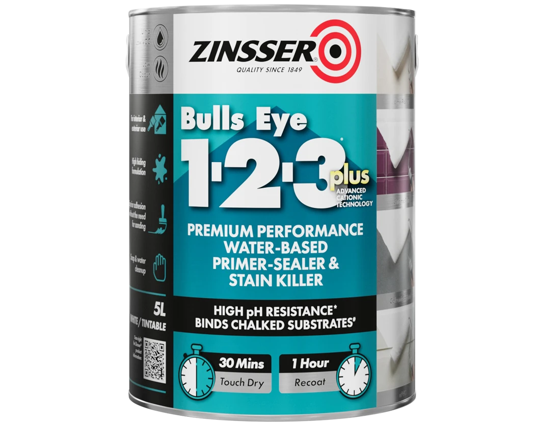 Bulls Eye® 1-2-3 Plus is a cationic, universal, water-based primer, sealer and stain-killer. It is ideal for interior and exterior painting projects.